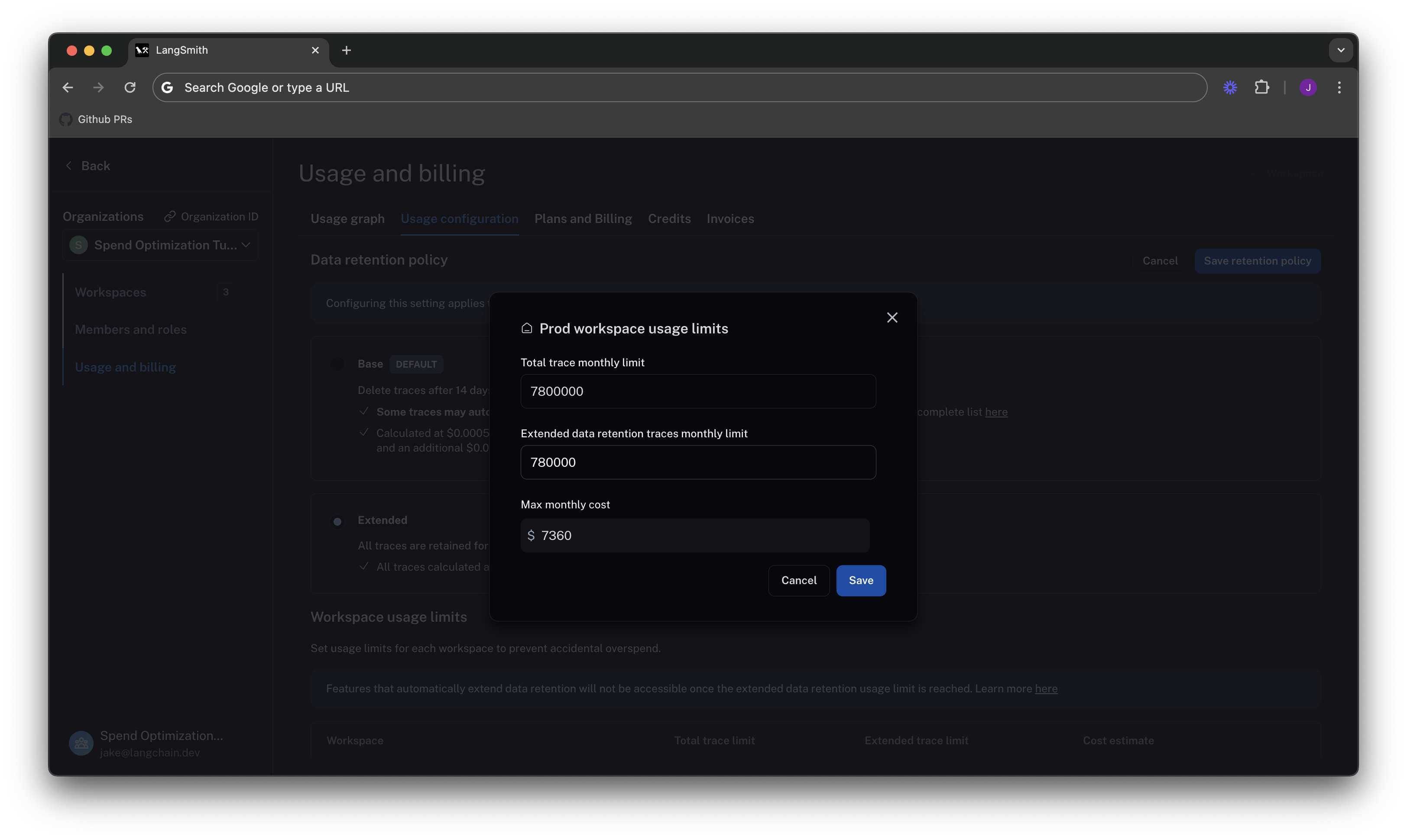 Now that our limits are set, we can see that LangSmith shows a maximum spend estimate across all workspaces: