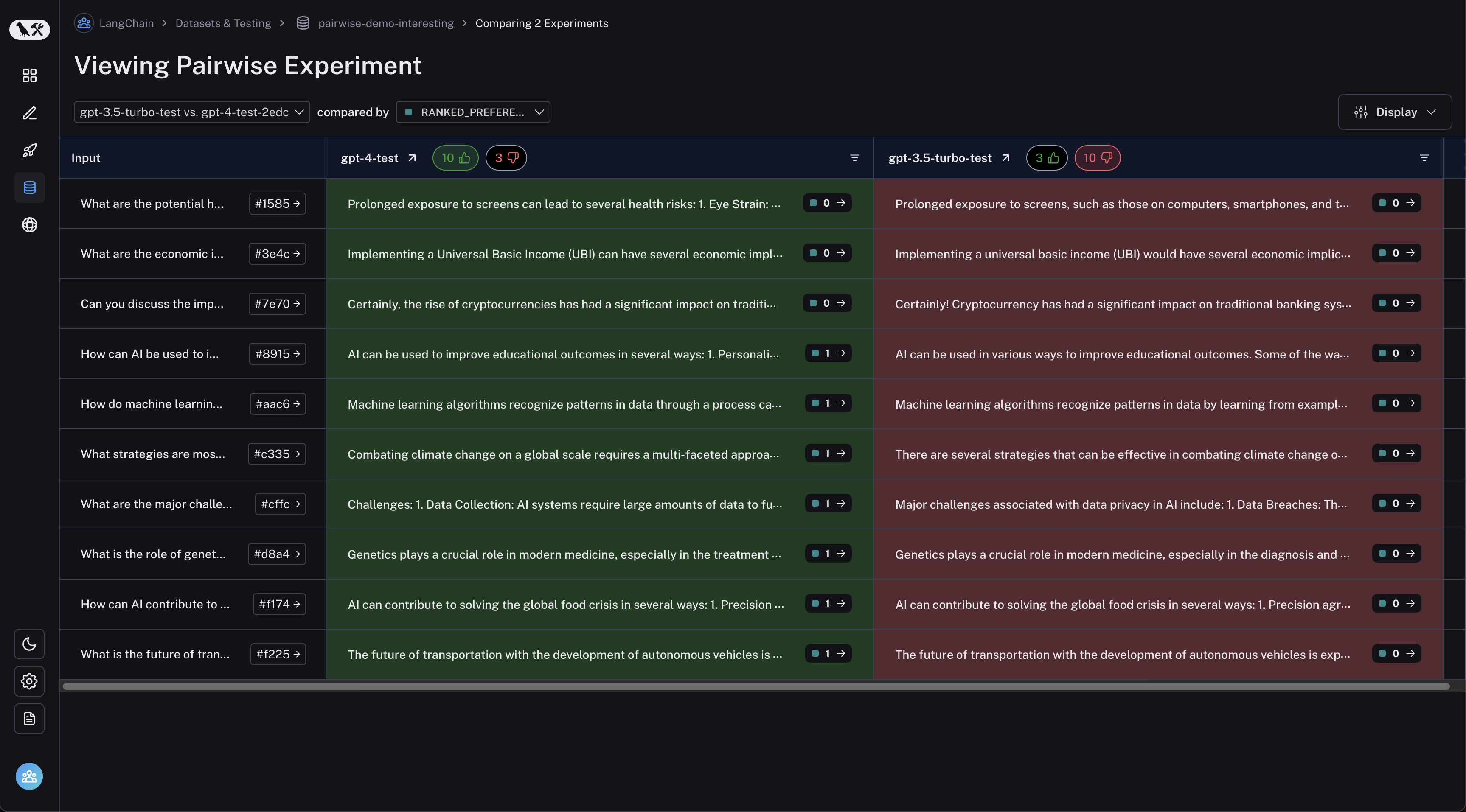 LangSmith supports evaluating existing experiments in a comparative manner. This allows you to score the outputs from multiple experiments against each other, rather than being confined to evaluating outputs one at a time. Think LMSYS Chatbot Arena - this is the same concept! To do this, use the evaluate() function with two existing experiments.